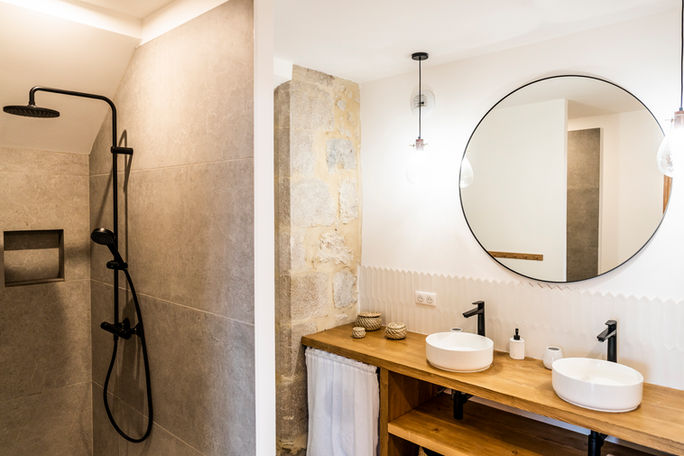 La salle de bain, installée sous la charpente d’origine, constitue un espace singulier, propice à la détente, avec une vue directe sur le ciel nocturne.