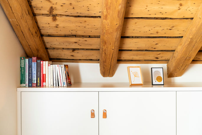 Détail de décoration intérieure mêlant matériaux naturels et objets anciens, illustrant l’ambiance chaleureuse des gîtes du Domaine des Frênes dans le Jura.
